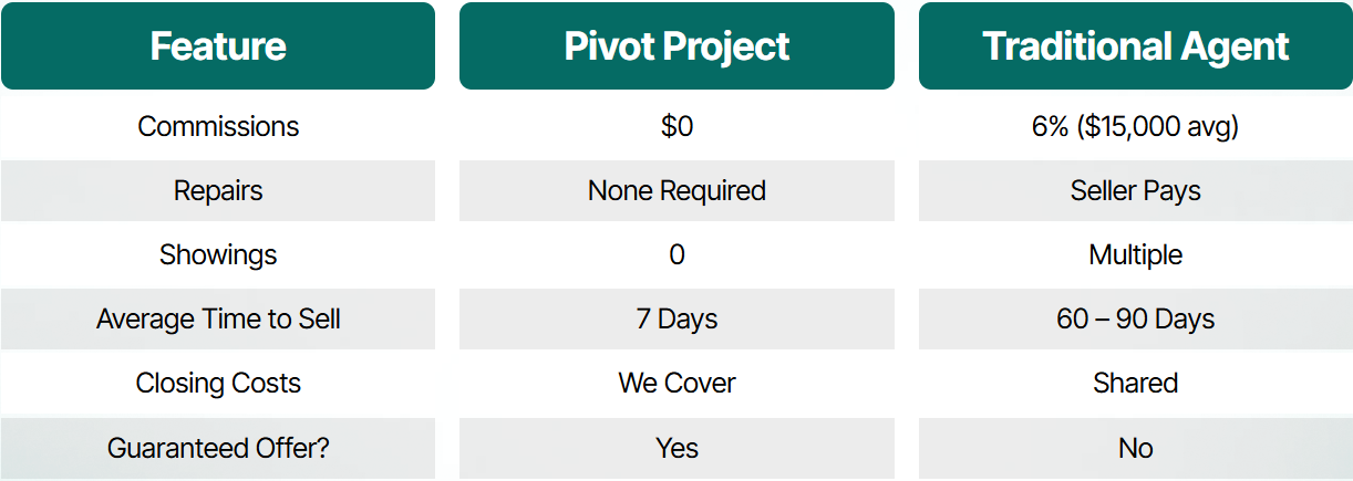 No repairs, painting, or cleaning needed. We’ll take care of it all cracked walls, messy tenants, old appliances... no problem.